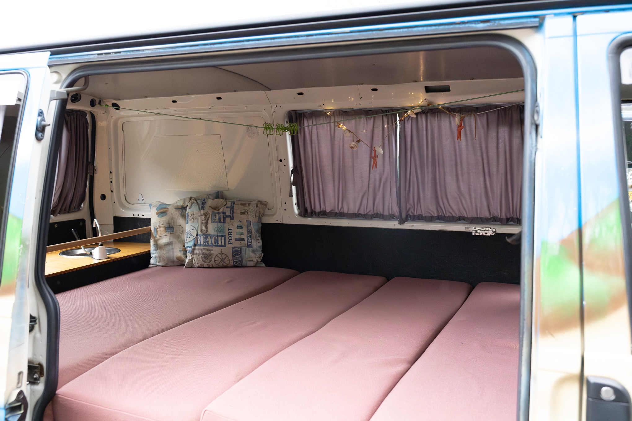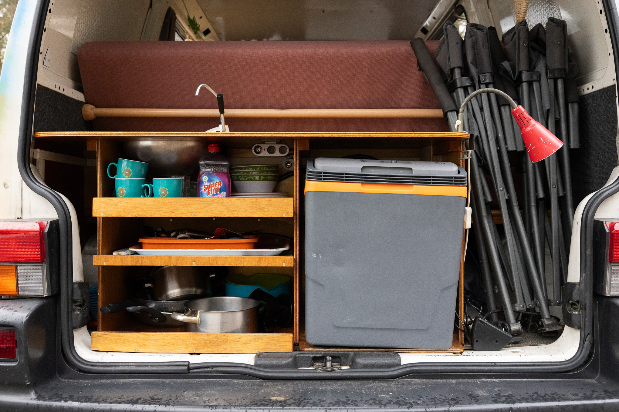 De 2 persoons camper Amsterdam heeft een queen size bed, een handige opklapbare tafel en veel opbergruimte. In het keukentje onder de achterklep vind je alles wat je nodig hebt. Met de twee losse kookplaatjes kun je heel gemakkelijk onder de klep of op een tafeltje koken.